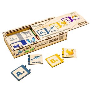 Іграшка виготовлена з безпечного та екологічно чистого матеріалу — натурального дерева. У наборі кількість пластин відповідає кількості букв алфавіту. До комплекту входять 33 елементи з різнокольоровими літерами та пластинки із зображенням тварин. Завдяки спеціальним виступам і пазам букви та картинки легко поєднуються між собою.