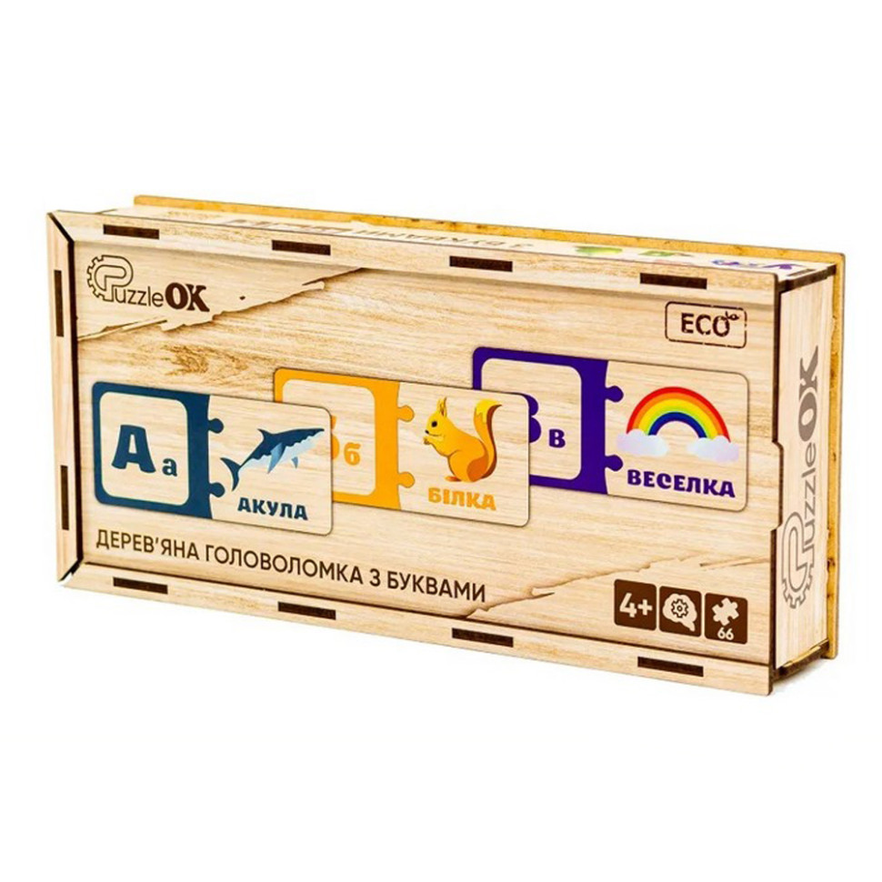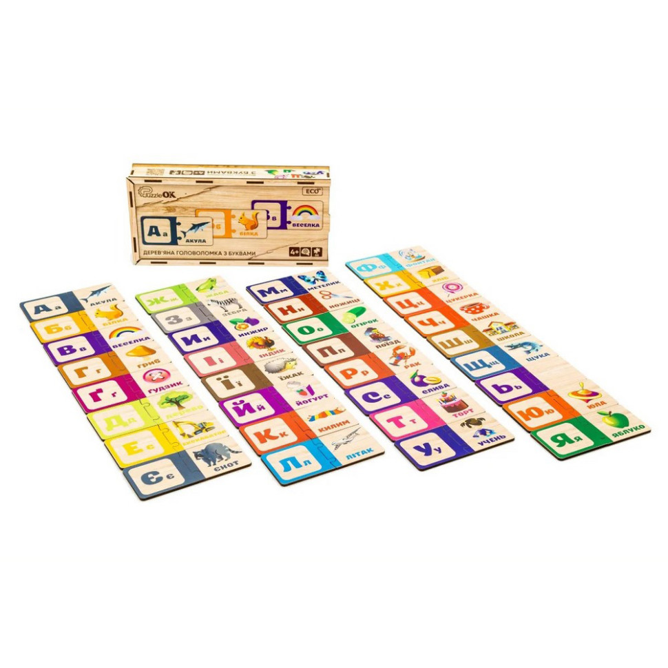 Дерев’яна навчально-розвивальна головоломка, що допомагає дітям легко та цікаво засвоїти букви українського алфавіту. Завдяки ігровій формі, вона підходить для малюків від 4 років.