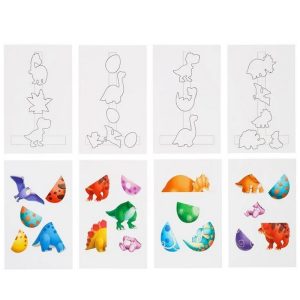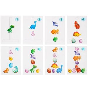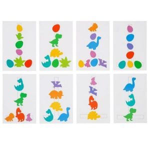 До складу гри входить яскравий тематичний планшет-основа з горизонтальними та вертикальними липучками — чудовий інструмент для вивчення напрямків. У комплекті 18 об’ємних елементів на липучках: динозаврики, кущики та яйця. Також додаються картки з різнорівневими завданнями — дитині потрібно розмістити фігурки відповідно до картинки, контуру чи силуету на зразку.