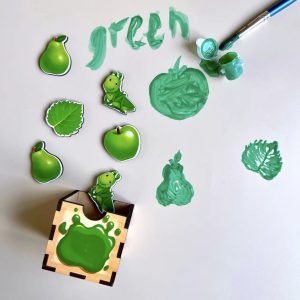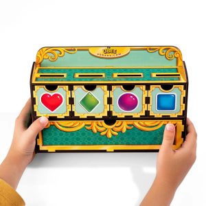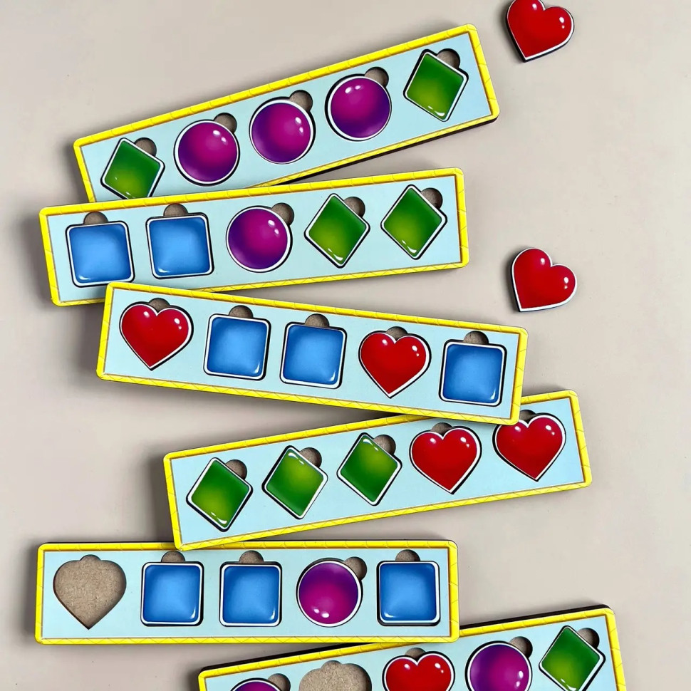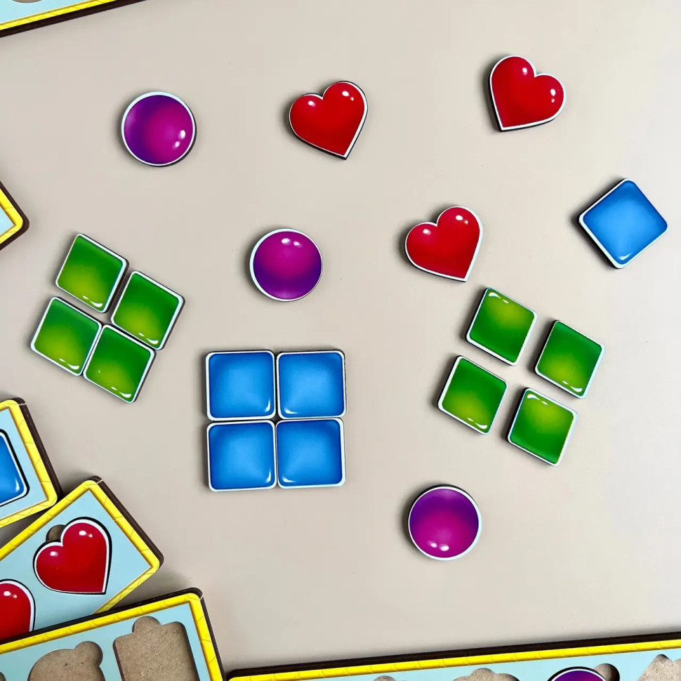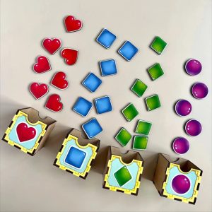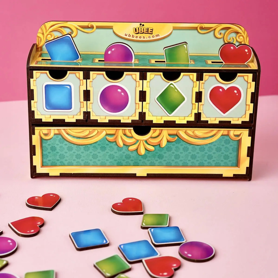 Комодик включає чотири тематичні ящички для сортування вставок за кольором і зображенням, а також один ящик для зберігання спеціальних планок. У комплект входить 6 планок та 30 фігурок, які дитина може сортувати за формою та кольоровою ознакою.