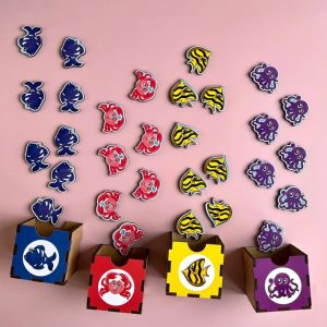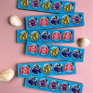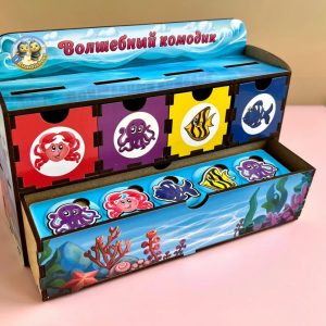 Цей навчальний комод має 4 кольорові шухлядки для класифікації фігурок за кольором або зображенням, а також окрему п’яту шухлядку, в якій зберігаються спеціальні планки для сортування. До набору входить 6 планок та 30 яскравих фігурок, що зображають мешканців морських глибин.