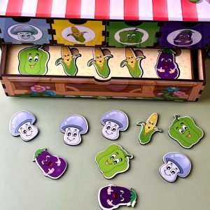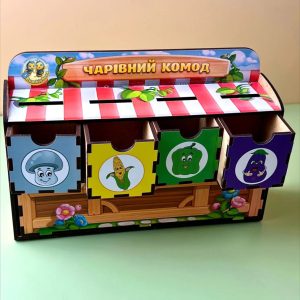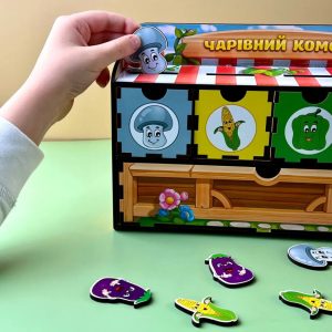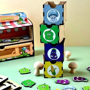 Цей яскравий комод створено для захопливого вивчення овочів та розвитку навичок сортування. До комплекту входять 6 вкладальних планок та 30 фігурок овочів, які потрібно розкласти відповідно до кольору чи форми.