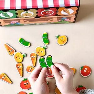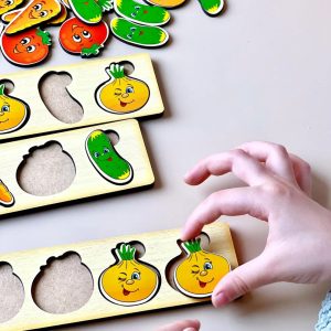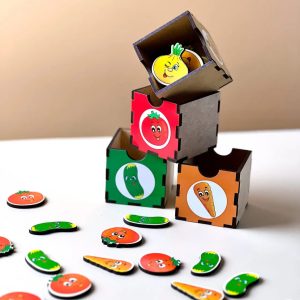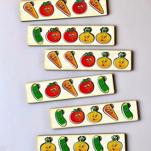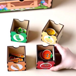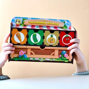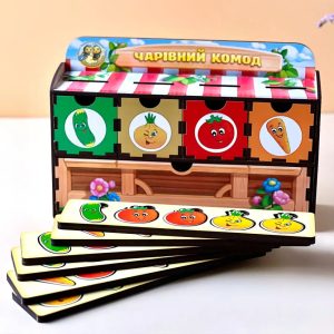 Цей яскравий сортер допомагає малюкам в ігровій формі вивчати овочі та розвивати навички класифікації. Комод складається з чотирьох кольорових шухлядок для сортування фігурок за малюнком, а також додаткової п’ятої шухлядки, де зберігаються планки для викладання.