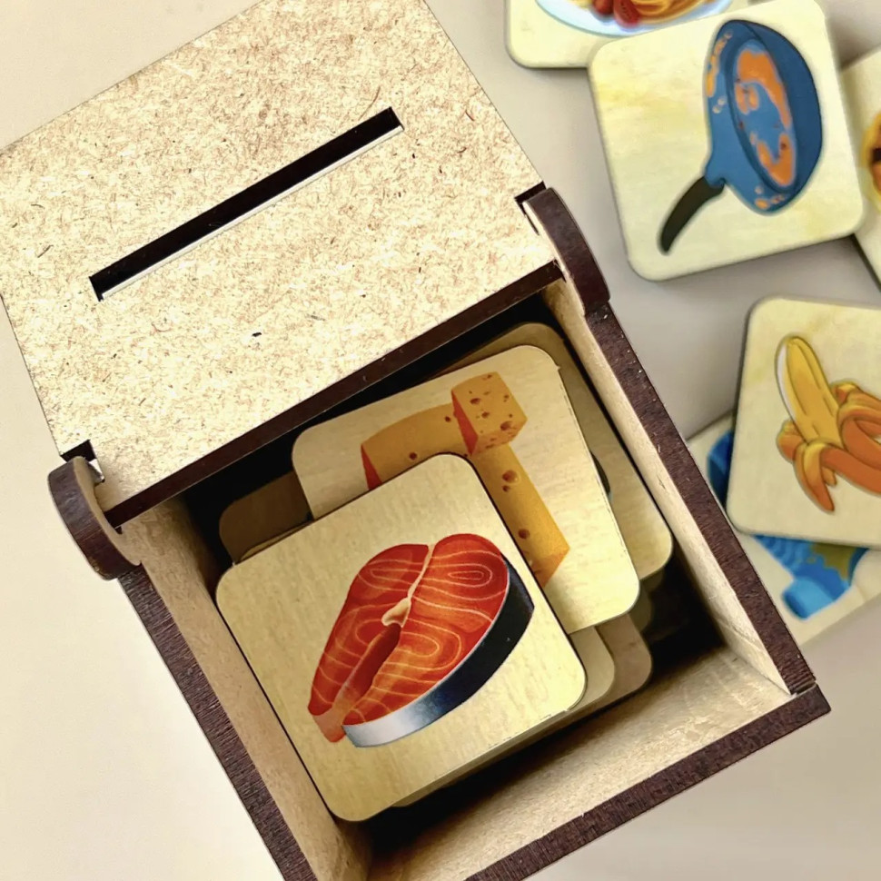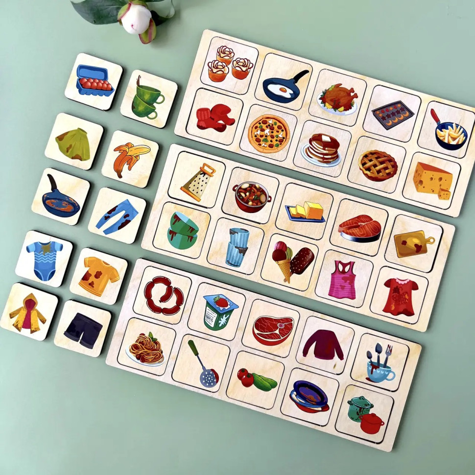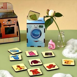 Цей пізнавальний набір допомагає дитині дізнатися більше про призначення та функції різних приладів, які є в кожному домі. У комплекті — 40 плашок із зображенням предметів побуту: брудного посуду, одягу, харчових продуктів і кухонного начиння. Завдання малюка — правильно розсортувати всі елементи по чотирьох тематичних шухлядках-комірках, що символізують техніку (наприклад, пральну машину, холодильник, плиту тощо).