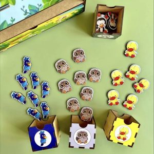 Цей яскравий набір допоможе дитині познайомитися з різноманіттям птахів. У комплекті — 4 кольорові шухлядки з тематикою птахів і 40 фішок із зображеннями різних пташок. Завдання малюка — правильно відсортувати фішки за відповідними пташиними категоріями.