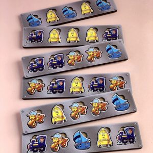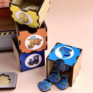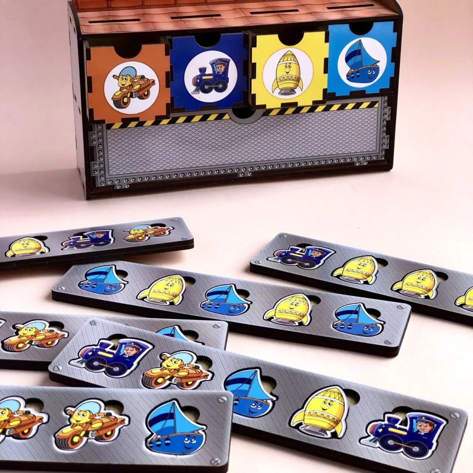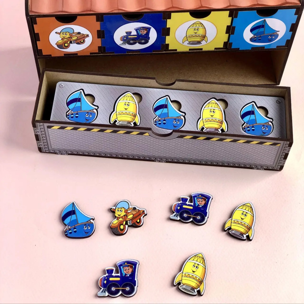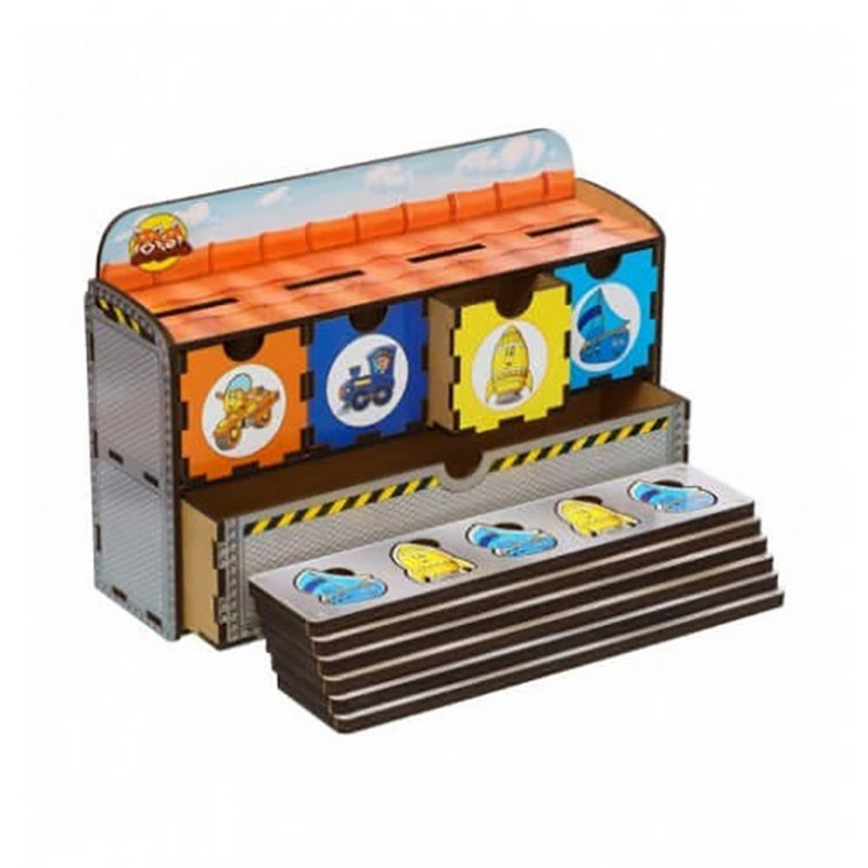 Цей пізнавальний набір складається з чотирьох кольорових шухлядок, призначених для сортування елементів за кольорами та зображеннями, і ще однієї окремої шухлядки для зберігання спеціальних планок. У комплект входять 6 планок і 30 яскравих фігурок із зображенням різних видів транспорту, які потрібно правильно розмістити.