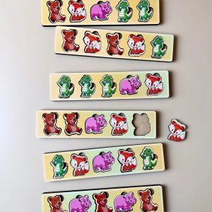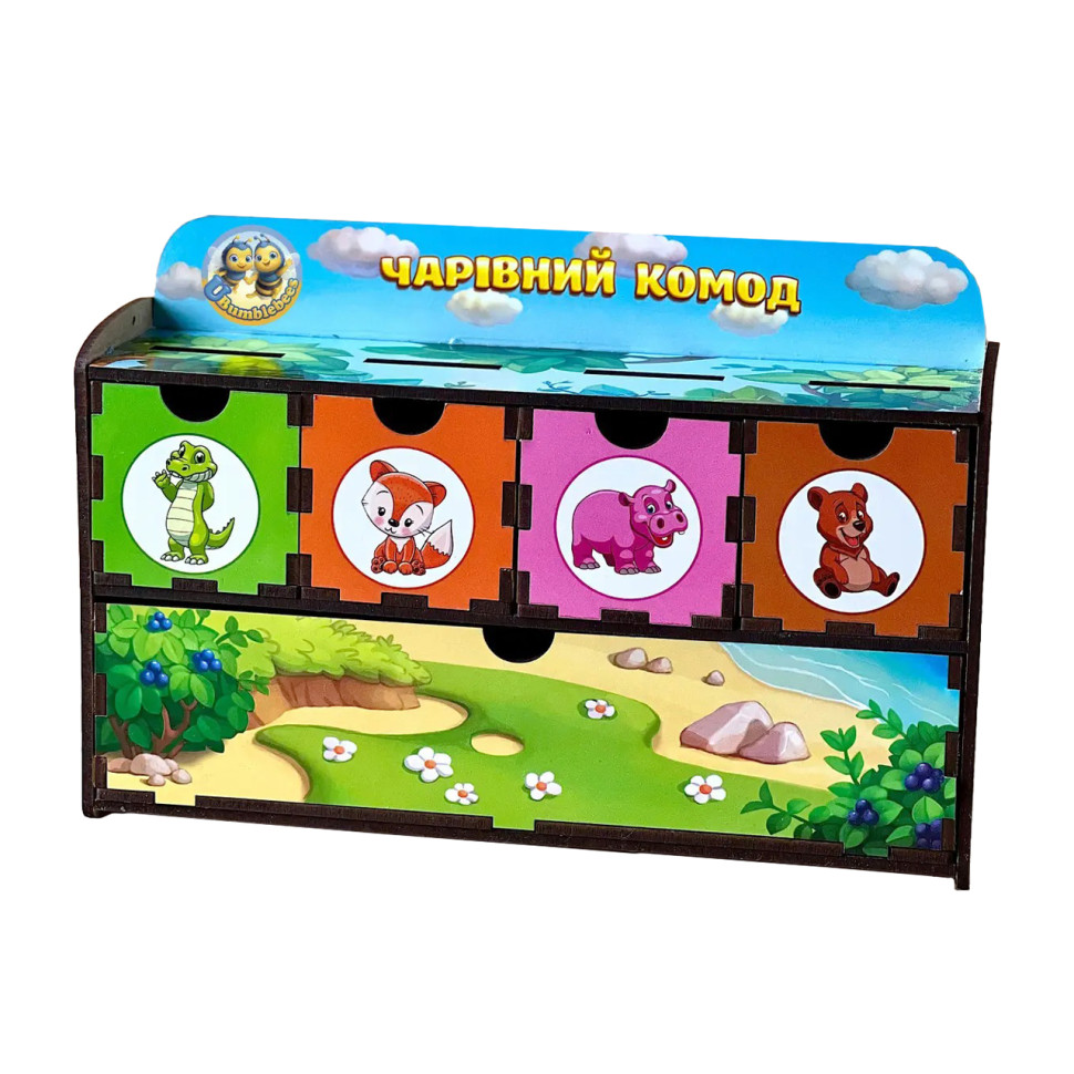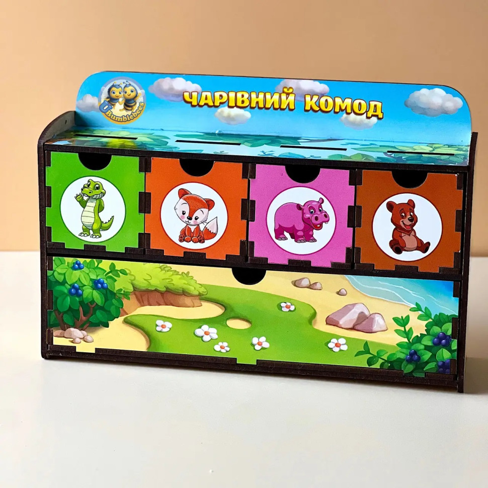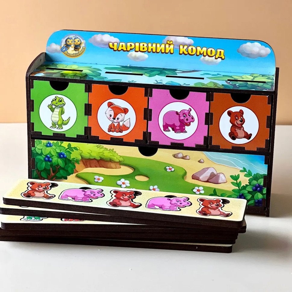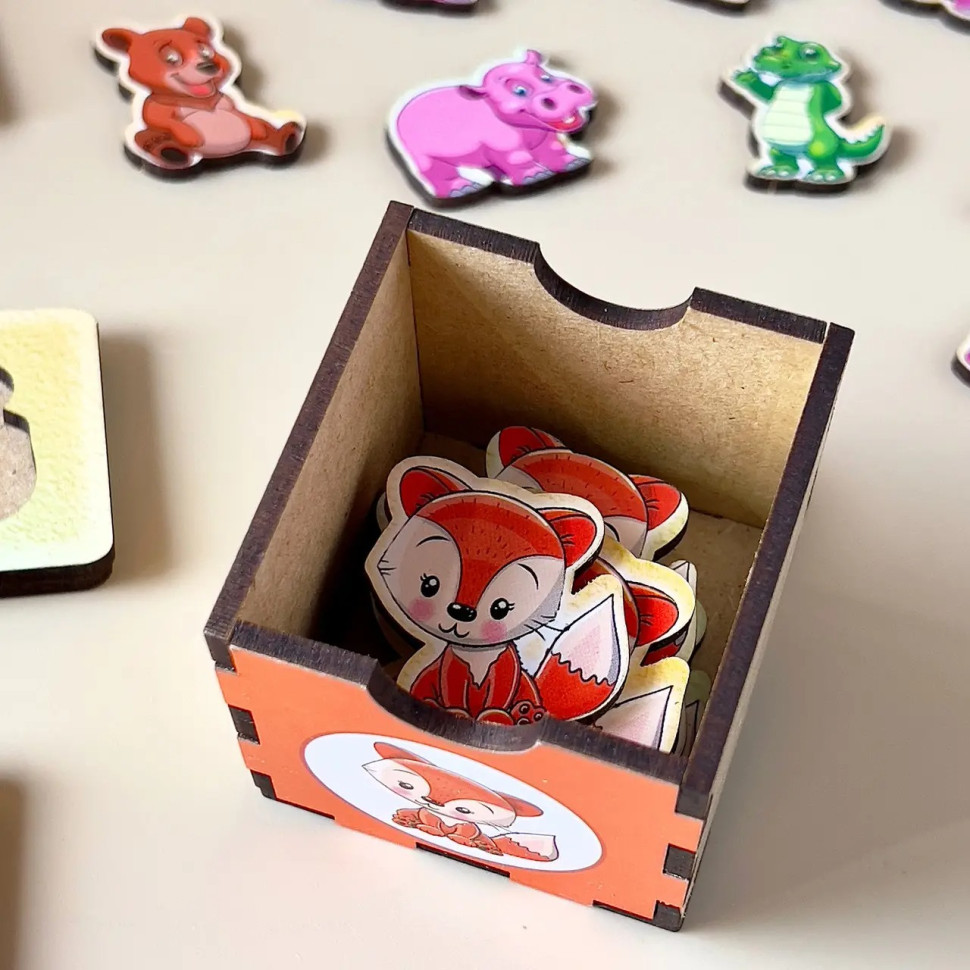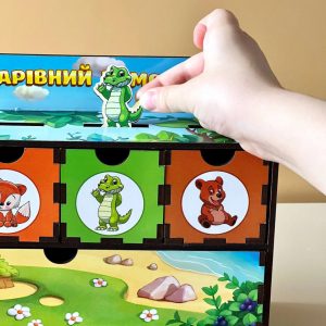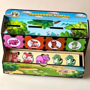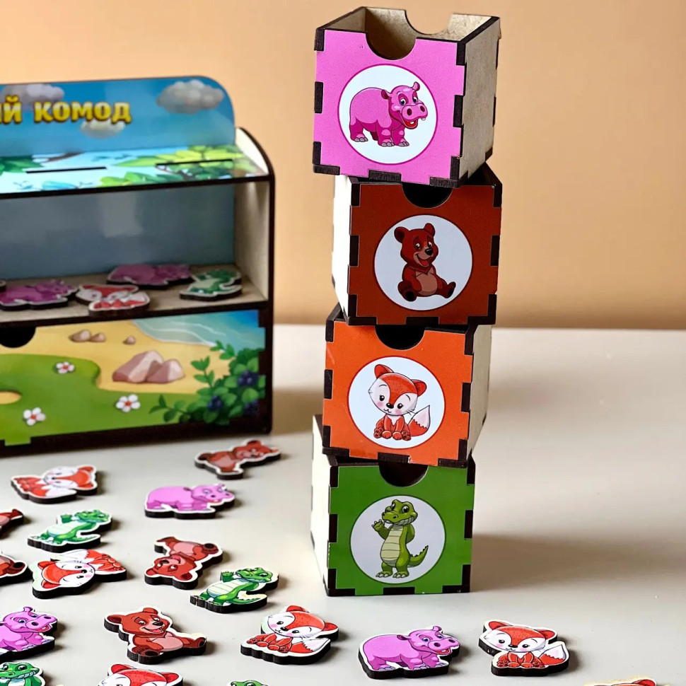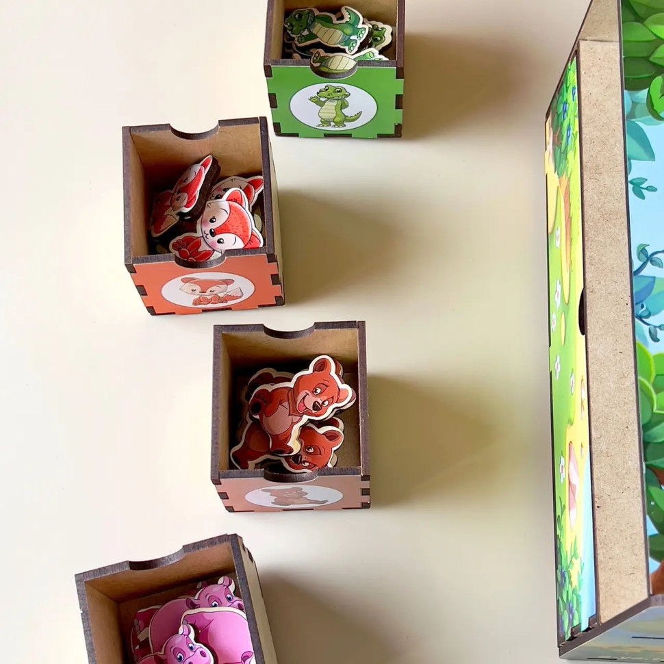 Цей навчальний набір створений для знайомства дитини з різними видами тварин. У комплект входять 4 кольорові шухлядки з тематикою тварин і 40 плашок із зображеннями різних звірів. Завдання малюка — правильно відсортувати фішки по відповідним тваринам.