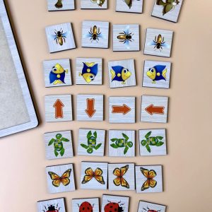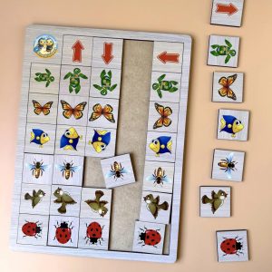 Основа-планшет із набірними елементами: 6 плашок зі спрощеними зображеннями об’єктів, 4 плашки зі стрілками, які задають напрямок, та 24 плашки для сортування. Усі елементи легко замінюються, тому щоразу можна створювати нові завдання для дитини.