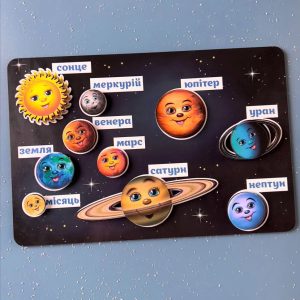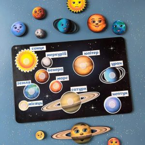 Створіть власну модель Сонячної системи з планетами на липучках! У процесі гри дитина дізнається назви планет, їх порядок розташування навколо Сонця та порівнює їхні розміри. Такий наочний формат допомагає краще засвоїти базові знання про космос і стимулює цікавість до астрономії.