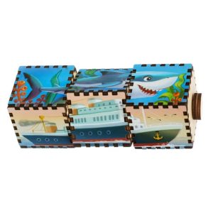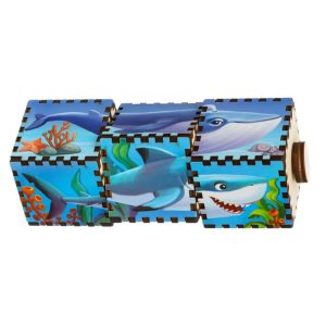 Цікава розвивальна гра складається зі стрижня з трьома рухомими кубиками, які можна обертати. Завдання дитини — зібрати цілісні зображення: кита, дельфіна, акулу або пароплав, поєднуючи мордочку, тулуб і хвостик кожного. Така діяльність чудово тренує зорову памʼять, логіку, уважність і дрібну моторику.