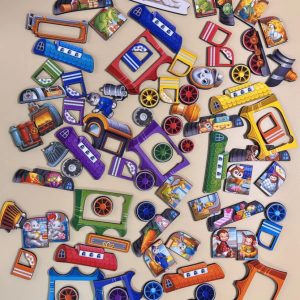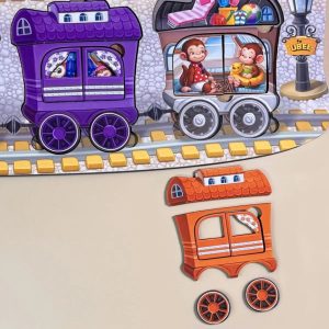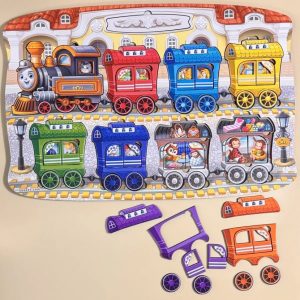 Дерев’яна розвивальна гра “Мега Потяг” — це яскравий двошаровий сортер, створений спеціально для дітей від 2 років. У комплекті — 81 деталь, серед яких локомотив та 7 вагонів. Пасажири нашого поїзда: совушки, зайчики, мавпочки, слоненята, жирафи, крокодили, гуси. А керує поїздом котик-машиніст. Кожен вагон має унікальний дизайн, дверцята праворуч, ліворуч і колеса — різного розміру.