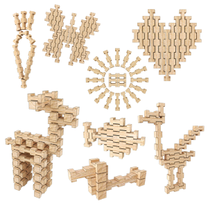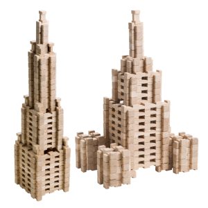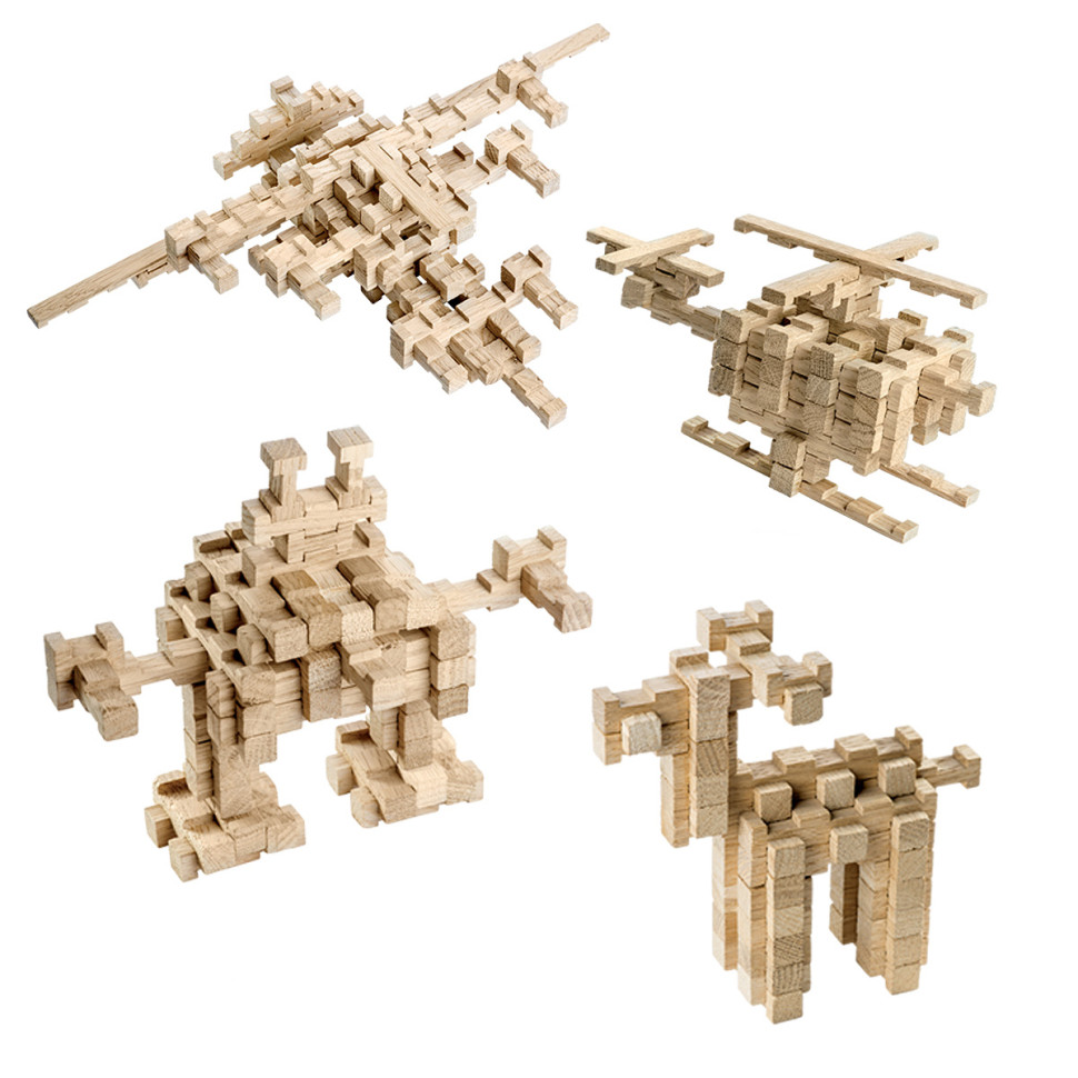 Цей великий дерев’яний набір відкриває широкі можливості для творчості та не обмежує фантазію дитини. З його допомогою можна втілювати будь-які ідеї — від найпростіших до найскладніших. А якщо деталей виявиться замало, їх легко можна докупити в комплектах на 60, 120 або 240 елементів.
