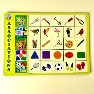 Дерев’яна розвивальна рамка-планшет містить п’ять яскравих тематичних зображень. До кожного малюнка потрібно підібрати п’ять квадратних елементів (загалом 25 плашок) із зображенням предметів або персонажів, які пов’язані з основною картинкою. Завдання дитини — уважно розглянути зображення та правильно відсортувати всі плашки у п’ять логічних рядів.