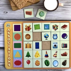 Дерев’яна рамка-планшет містить п’ять рядів, кожен з яких присвячений окремій геометричній формі. У наборі — 25 квадратних плашок із зображенням різних предметів, що нагадують за формою коло, квадрат, трикутник, прямокутник чи овал. Завдання дитини — розподілити всі плашки у відповідні ряди, орієнтуючись на форму.