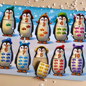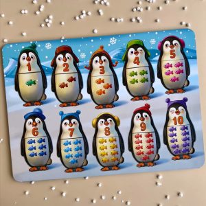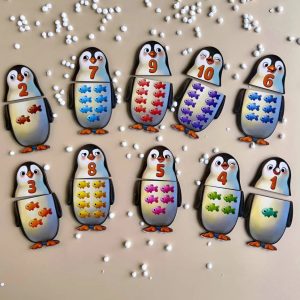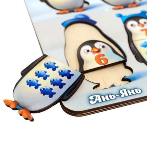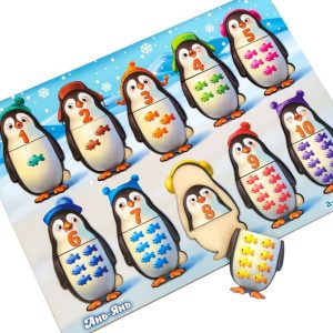 Цікава навчальна гра з 10 пінгвінами-вкладишами зробить знайомство з цифрами простим і захоплюючим. Кожен пінгвін складається з двох частин: на одній зображена цифра, а на іншій — відповідна кількість рибок (від 1 до 10). Щоб правильно скласти пінгвіна, потрібно порахувати рибок і знайти відповідне число. Для найменших діток є підказка — кольори шапочок на обох частинах мають збігатися.
