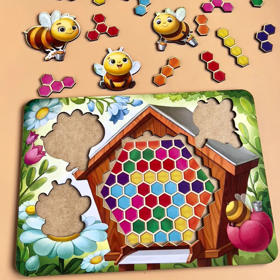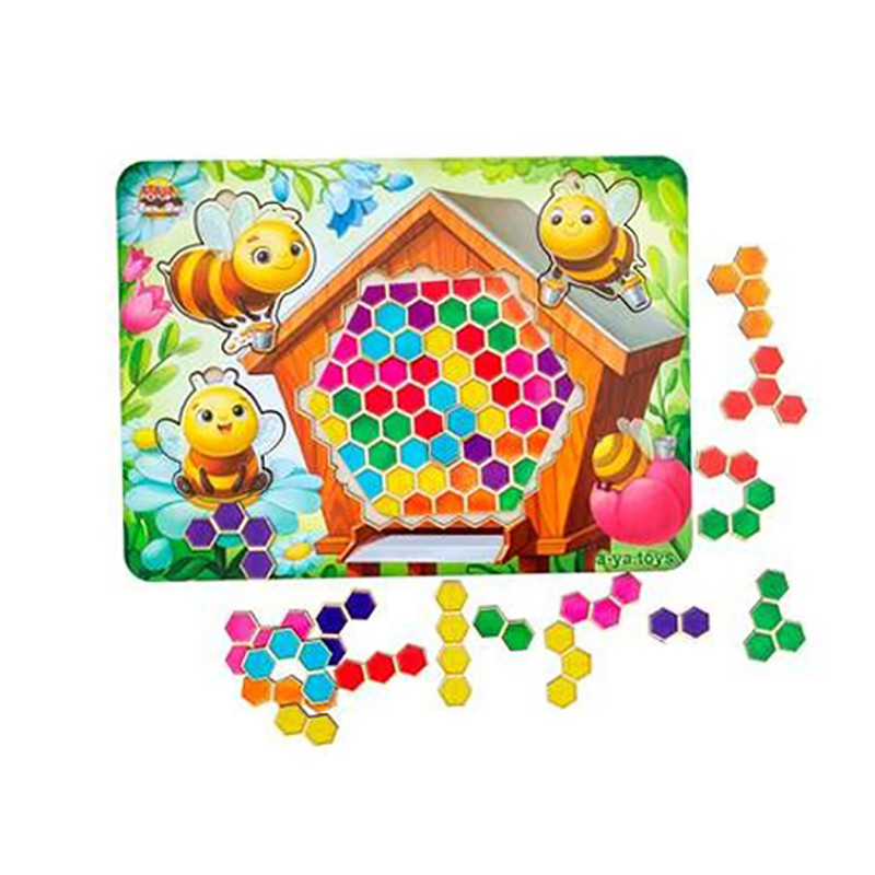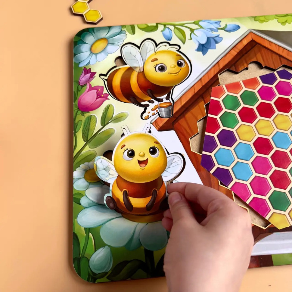 Ця гра поєднує одразу два формати: з одного боку — це вкладиші у вигляді бджілок, які зручно витягати пальчиками, а з іншого — справжній тетріс зі стільників. У комплекті є зразок-зображення, який допоможе зібрати тетріс правильно. Малюкам буде цікаво просто розміщувати бджілок на свої місця або сортувати елементи за кольорами.