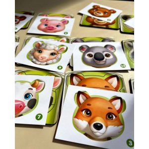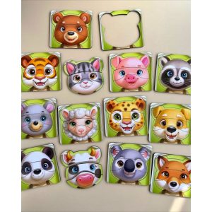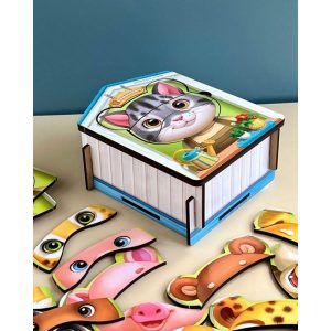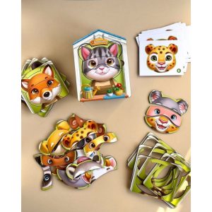 У наборі — 39 деталей і 13 карток із зображеннями тварин. Завдання дитини — скласти тваринку, як на малюнку. А ще гра дозволяє проявити фантазію: можна створювати власних казкових звірят, наприклад, додати котику вушка тигра або посмішку собачки.