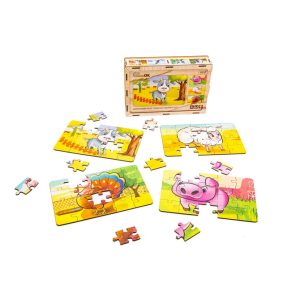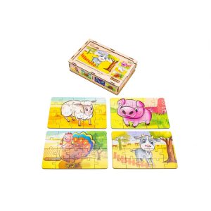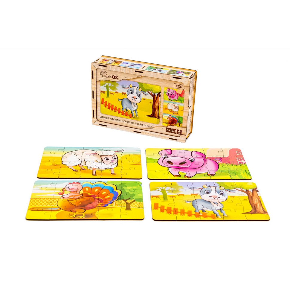 Дерев’яна розвиваюча іграшка-пазл “Свійські тварини 4в1” зацікавить дитину завдяки насиченим кольорам і милим зображенням свійських тварин. У наборі – 4 пазли із зображеннями ягняти, віслючка, поросятка та індички, які малюки легко впізнають.