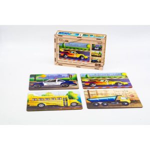 Дерев’яна розвиваюча іграшка-пазл “Транспорт 4в1” — чудовий варіант подарунка для дитини. У набір входять 4 яскраві пазли із зображеннями різних видів транспорту: легковика, самоскида, автобуса та поліцейської машини, а також зручна дерев’яна коробка із засувною кришкою для зберігання.