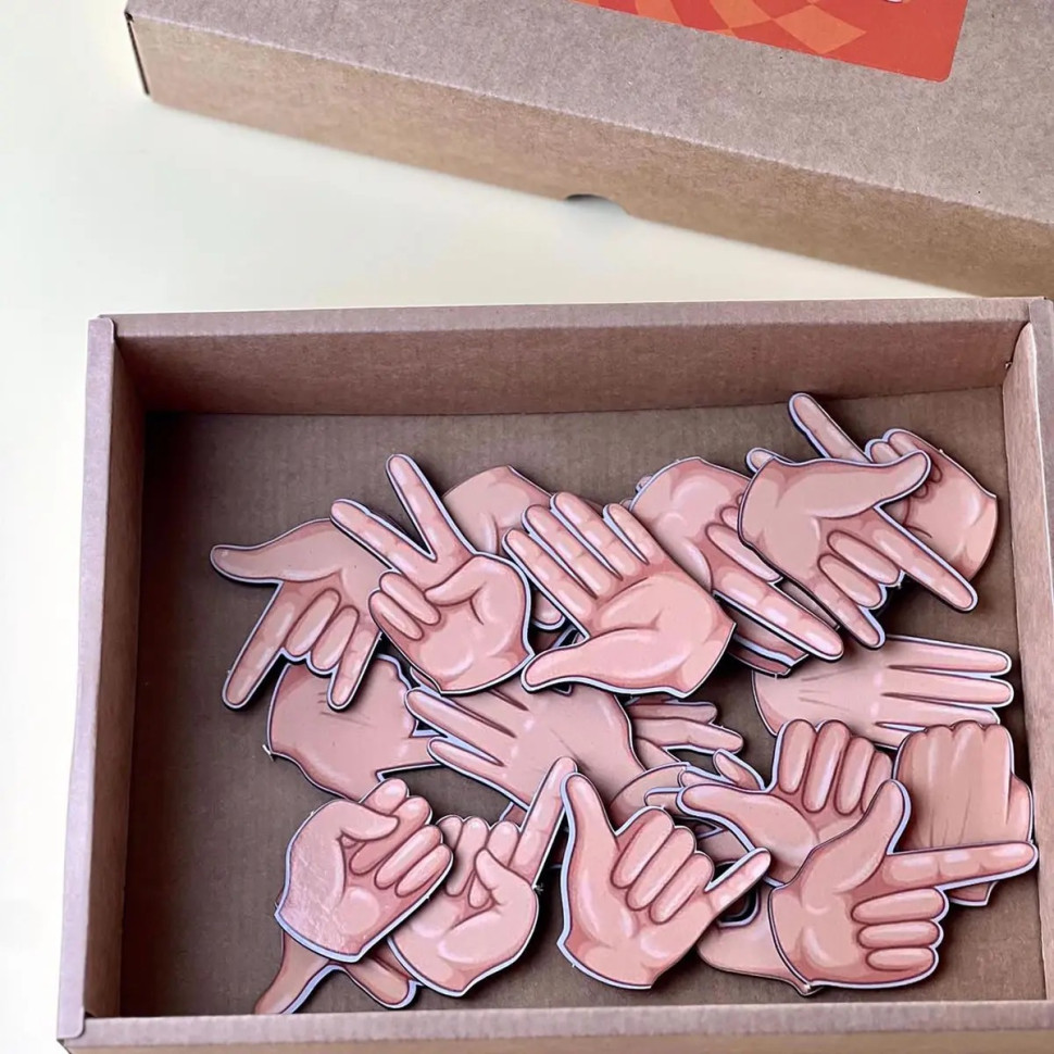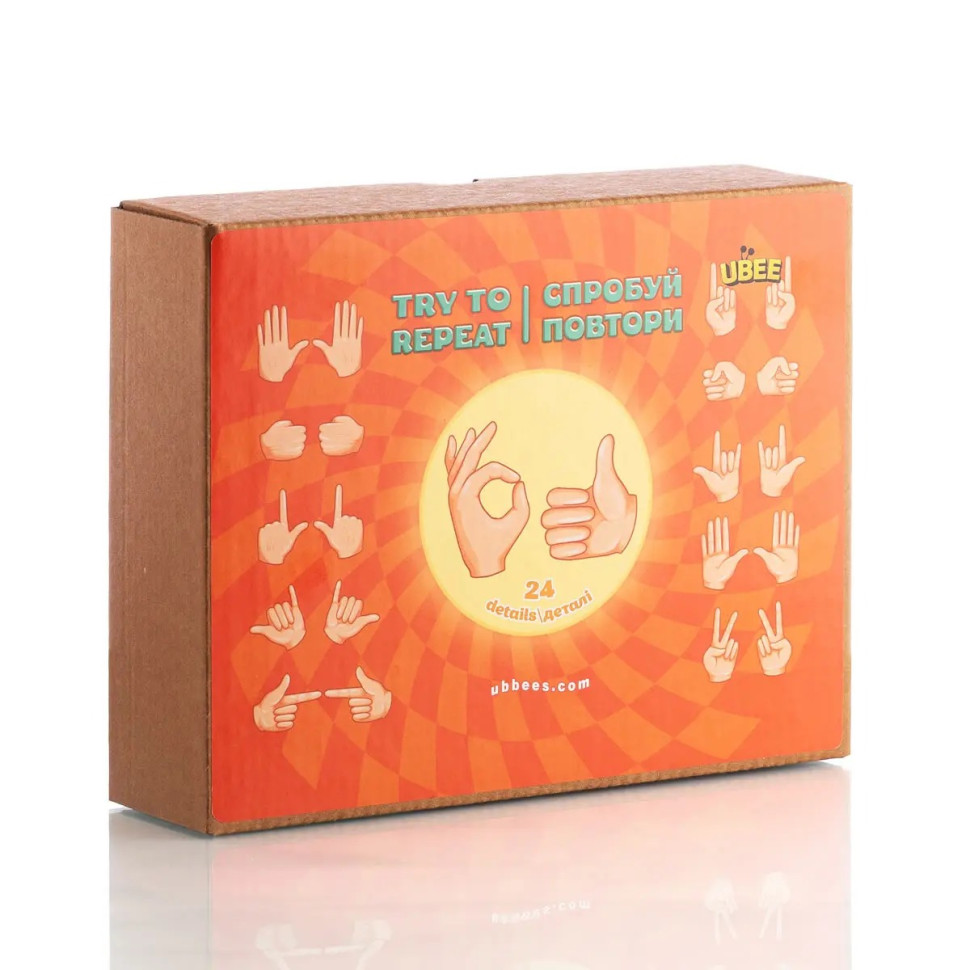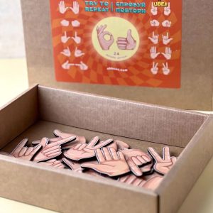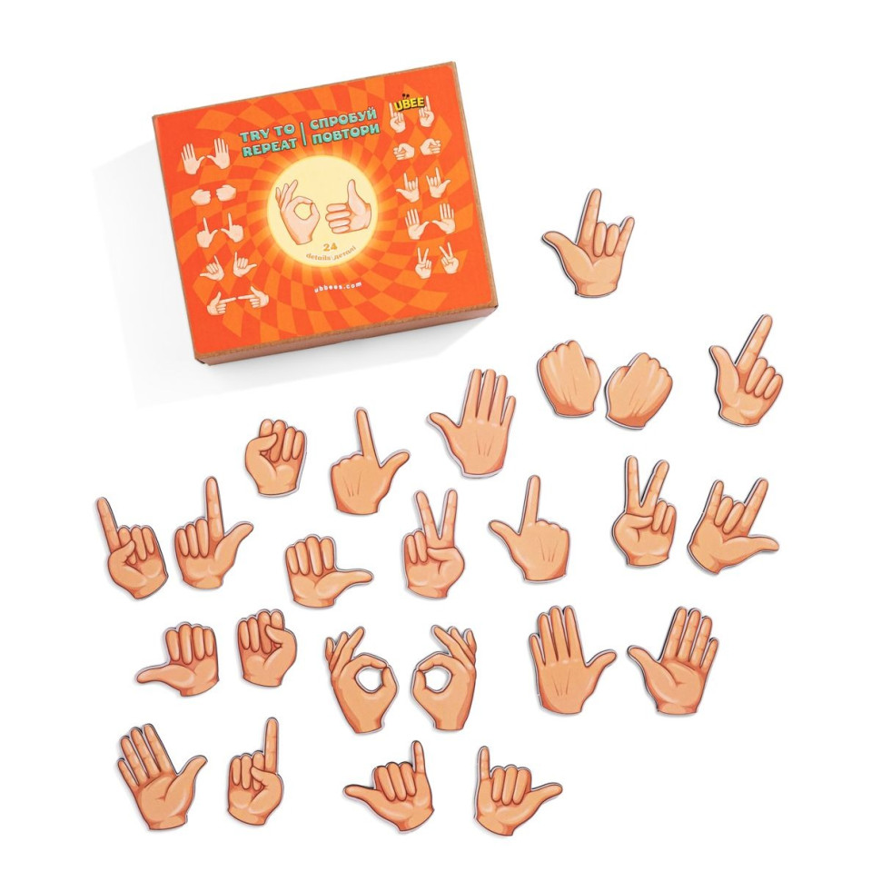 Разом з дитиною уважно розгляньте всі долоньки. Запропонуйте відтворити один із жестів — спочатку однією рукою, потім іншою. Коли дитина навчиться робити рухи обома руками одночасно, можна ускладнювати завдання: викладати комбінації пар та виконувати їх на швидкість. Додатково можна грати так: мама показує жест, а дитина шукає його серед карток у коробці. Розкажіть дитині значення кожного жеста та назви пальчиків.