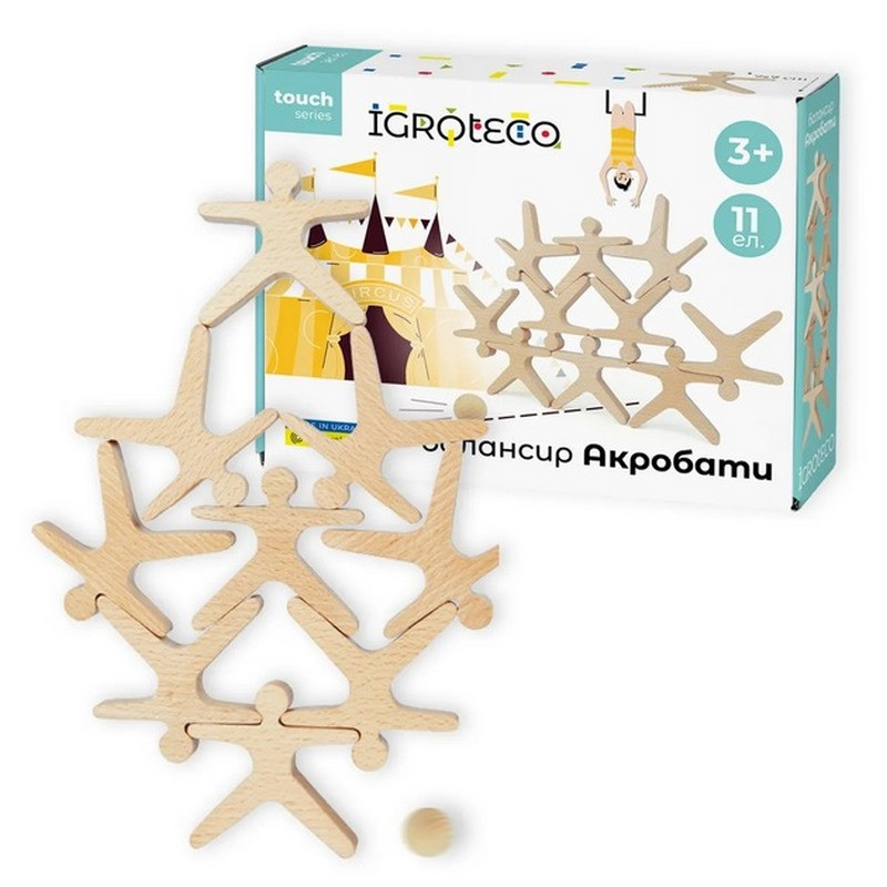 Дерев’яні фігурки у формі чоловічків створені так, щоб легко з’єднуватися між собою різними способами — це дає змогу зводити різні акробатичні вежі. Гра сприяє розвитку у дитини координації, точності рухів та посидючості. Варіанти гри: будування балансуючих конструкцій, створення веж з фігурок, гра в боулінг (збивати кулькою фігурки), запускання кульки між акробатами, не руйнуючи вежу. У комплекті: 10 фігурок-акробатів та кулька. Рекомендовано для дітей від 3 років, оскільки містить дрібні деталі! Матеріали: натуральне дерево, акриловий лак на водній основі (сертифікований), папір.