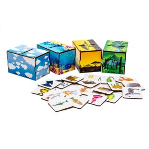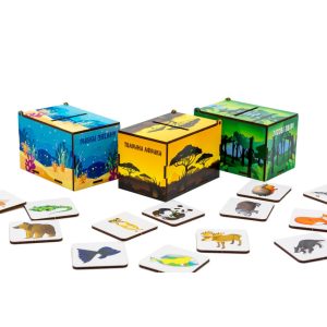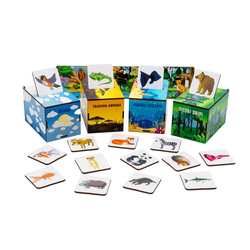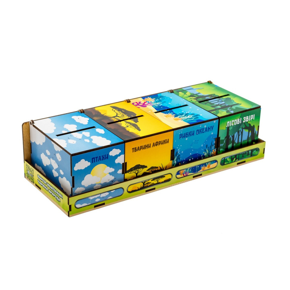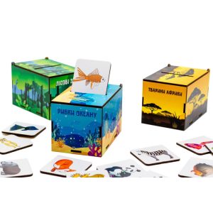 Гра-сортер “Чарівна природа” призначена для дітей від 3 років і знайомить малюків з різними тваринами, що мешкають у різних середовищах. У комплект входять чотири дерев’яні коробочки, оформлені яскравими ілюстраціями: африканська савана з баобабами, густий ліс, океан з морськими мешканцями та небо з сонцем і хмарами. У верхній частині кожної коробочки є проріз для вкладання дерев’яних пластин із зображеннями тварин — птахів, риб, звірів.