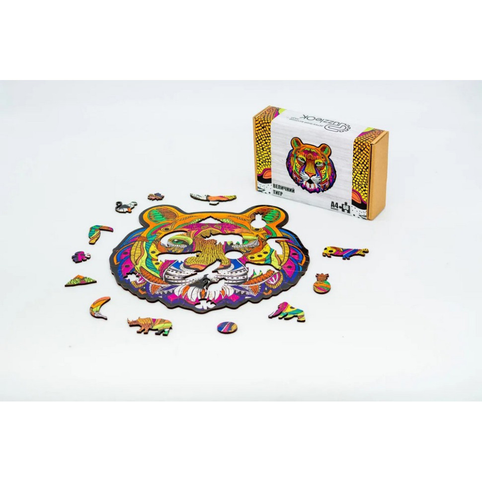 Відкрийте для себе силу і витонченість дикої природи з фігурним дерев’яним пазлом “Величний тигр”! Формат А4, унікальні деталі складаються у вражаючий образ тигра. Виготовлений з екологічно чистих матеріалів і упакований у зручну картонну коробку, цей пазл стане чудовим подарунком для шанувальників величних тварин.