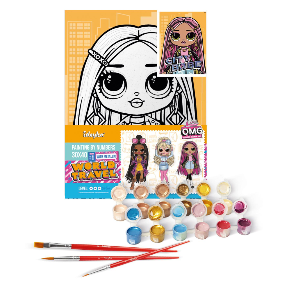 – Палітра пронумерованих акрилових фарб у контейнерах: звичайні та металізовані, до 3-х відтінків.