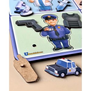 Набір із 4 пазлів, на кожному з яких зображено представника певної професії: лікар, кухар, поліцейський та пожежник. Кожен пазл складається з 4 частин, які потрібно правильно поєднати, щоб визначити професію героя. До кожного персонажа додається по 4 предмети, що відповідають його діяльності. Завдання дитини — розмістити ці предмети відповідно до професії, адже пожежник не може гасити вогонь тістечком, а поліцейський не користується м’ясорубкою на службі.