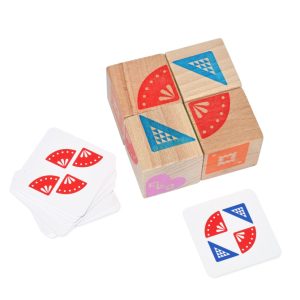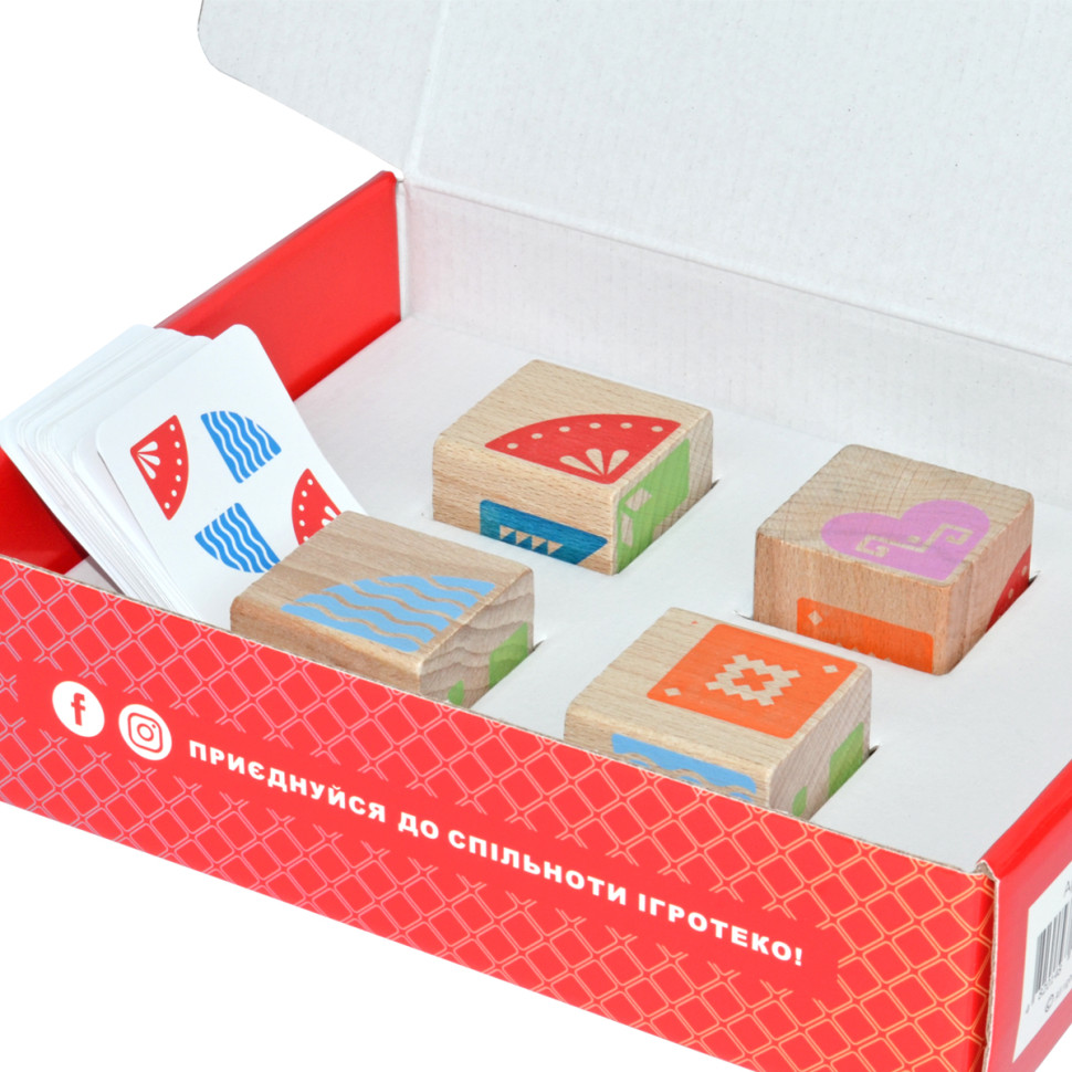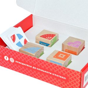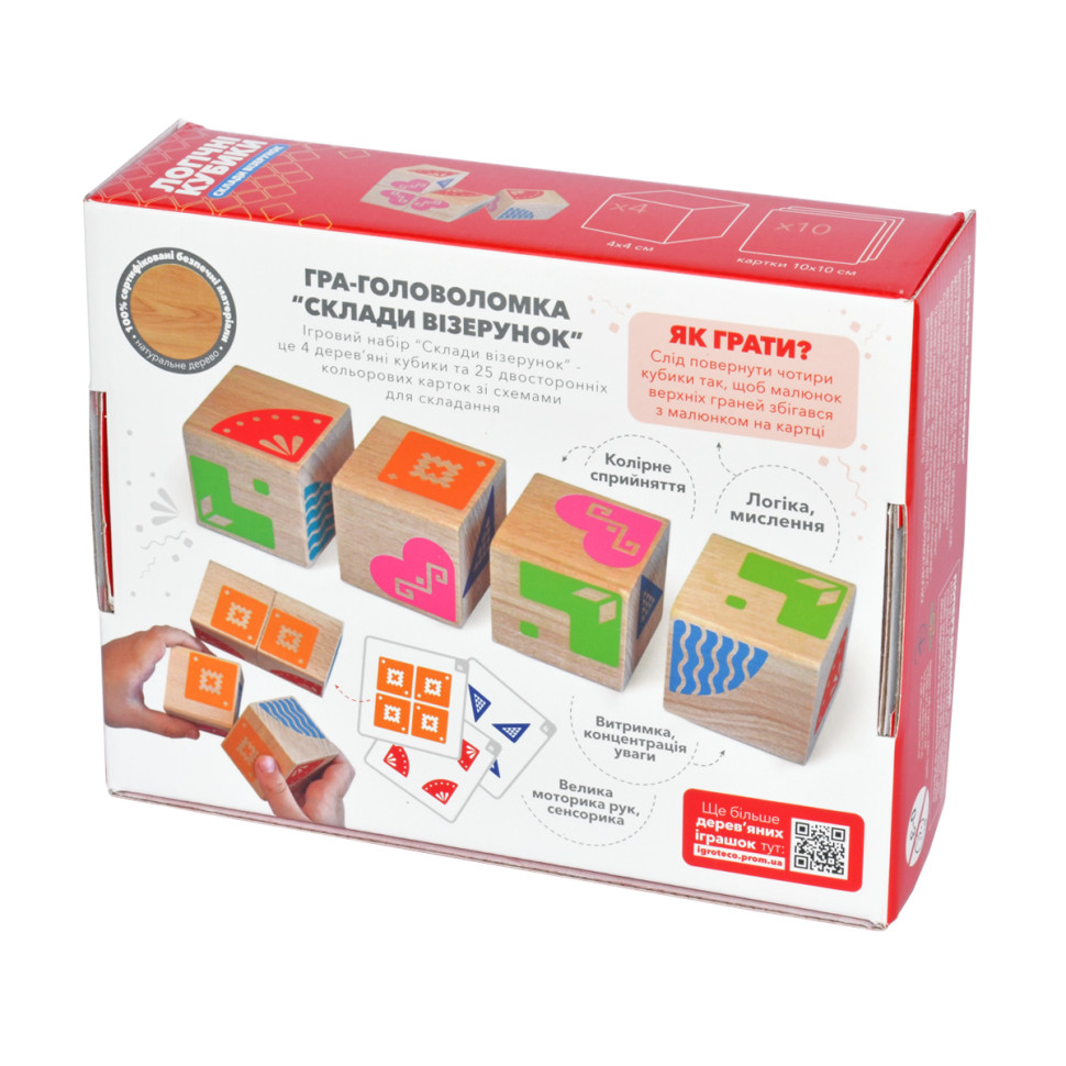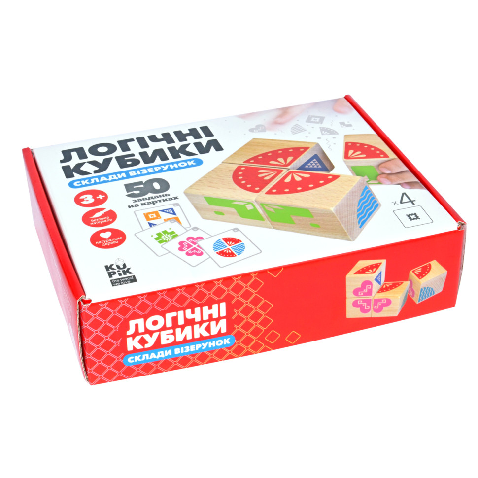 Логічні кубики “Склади візерунок” — чудова логічна гра для дітей віком від 3 років. До набору входять 4 дерев’яні кубики та 25 яскравих двосторонніх карток із схемами для складання.