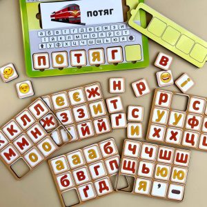 У комплекті ви знайдете основу-планшет, 74 плиточки з літерами, 2 плитки зі знаками та 84 тематичні картки із зображеннями на різні теми: тваринні звуки, сезони, спорт, їжа, частини тіла, рослини, погодні явища тощо.