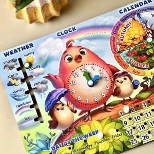 Набір «Календар Пташка» (англійська) – включає в себе основу з підставкою та комплект пластикових кнопок для позначення днів тижня й чисел місяця. Фон календаря яскраво оформлений і розділений на тематичні секції, що допомагають дитині ознайомитися з годинником, сезонами, днями тижня та назвами місяців.