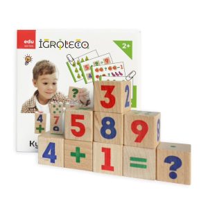 У комплект входять 9 кубиків із цифрами від 0 до 9 та математичними символами (+, –, ×, ÷). Завдяки цьому дитина може складати власні приклади, тренуватися в обчисленнях і виконувати завдання різної складності.