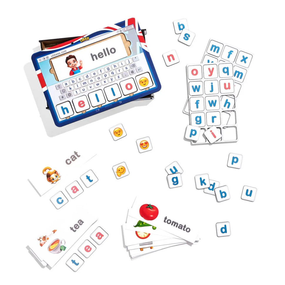 У наборі: основа-планшет, 74 плашки з літерами, 2 плашки зі знаками, а також 84 картки із зображеннями різної тематики — звуки тварин, пори року, спорт, їжа, частини тіла, рослини, погода та інше.