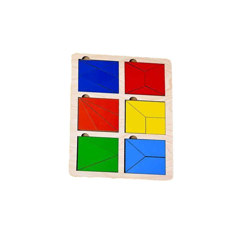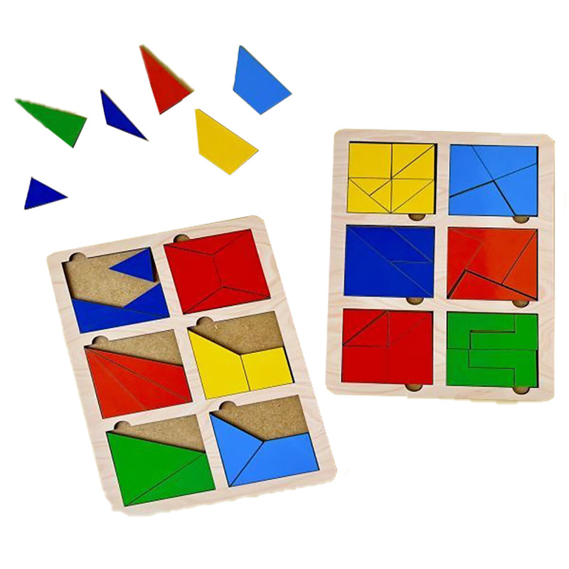 У набір входять два планшети, кожен з яких містить по 6 квадратів. Кожен квадрат розділений на частини (3 або 4), які відрізняються формою та кольором. Складаючи фігури, дитина виконує різні завдання, що відрізняються рівнем складності, і водночас вчиться співвідносити частини з цілим. Така гра знайомить із базовими геометричними формами, відтінками кольорів, розвиває сенсорне сприйняття та вміння створювати власний алгоритм дій.