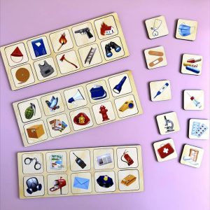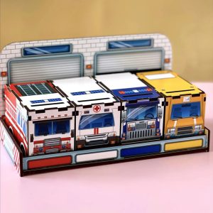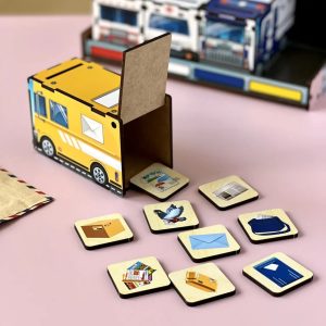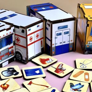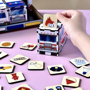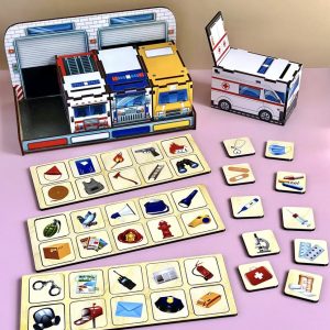 Этот познавательный игровой набор предназначен для знакомства ребёнка с различными типами служебного транспорта. В комплект входят 4 тематических грузовика и 40 карточек с изображениями разнообразных предметов и персонажей. Задача малыша — правильно рассортировать карточки, размещая их в подходящие машинки.