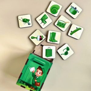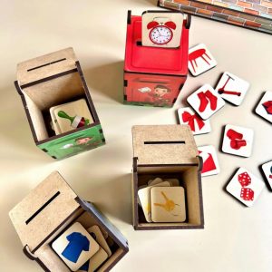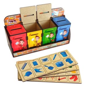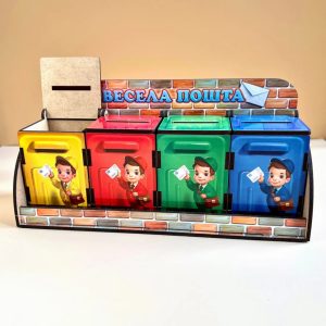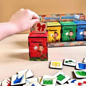 Яркий деревянный комод выполнен в виде четырёх почтовых ящиков разных цветов. В комплекте 40 тематических фишек: красного, синего, жёлтого и зелёного цветов. Задача ребёнка — распределить все элементы по ячейкам соответствующего цвета.