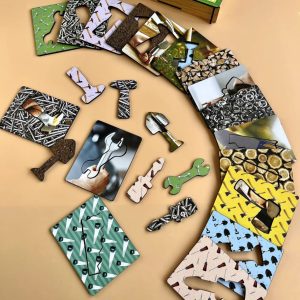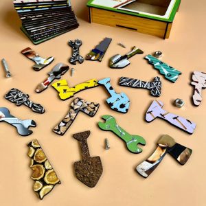 Деревянные вкладыши «Инструменты». В комплект входит 18 деревянных карточек с изображениями различных инструментов. Предложите малышу подобрать каждому инструменту свой «домик» — рамочку, которая соответствует не только по форме, но и по рисунку.