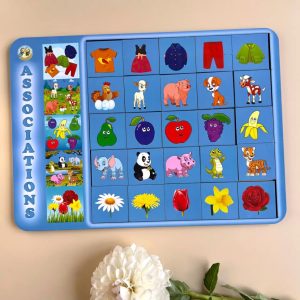 Деревянный развивающий планшет с рамкой содержит пять различных тематических изображений. К каждой основной картинке нужно подобрать по пять квадратных карточек (всего 25 элементов), на которых изображены предметы или персонажи, связанные с основным сюжетом. Задача ребёнка — внимательно рассмотреть изображения и правильно разложить все элементы в пять тематических рядов.