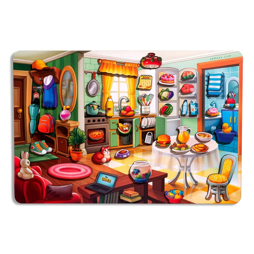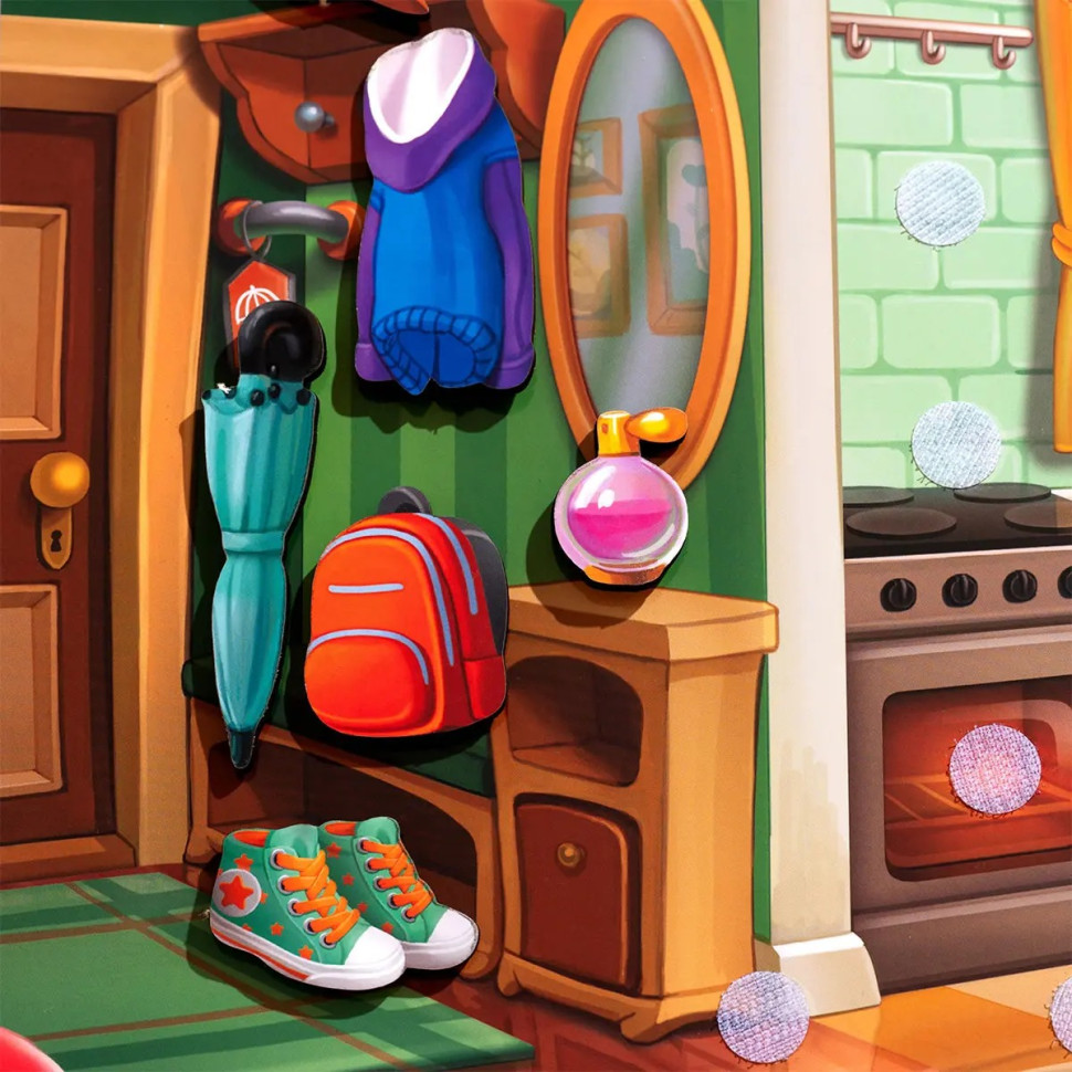 В наборе могут быть разнообразные предметы – игрушки, книги, одежда – которые нужно разложить по местам, а также элементы, связанные с кормлением Вани: разные продукты, которые следует правильно подобрать.