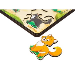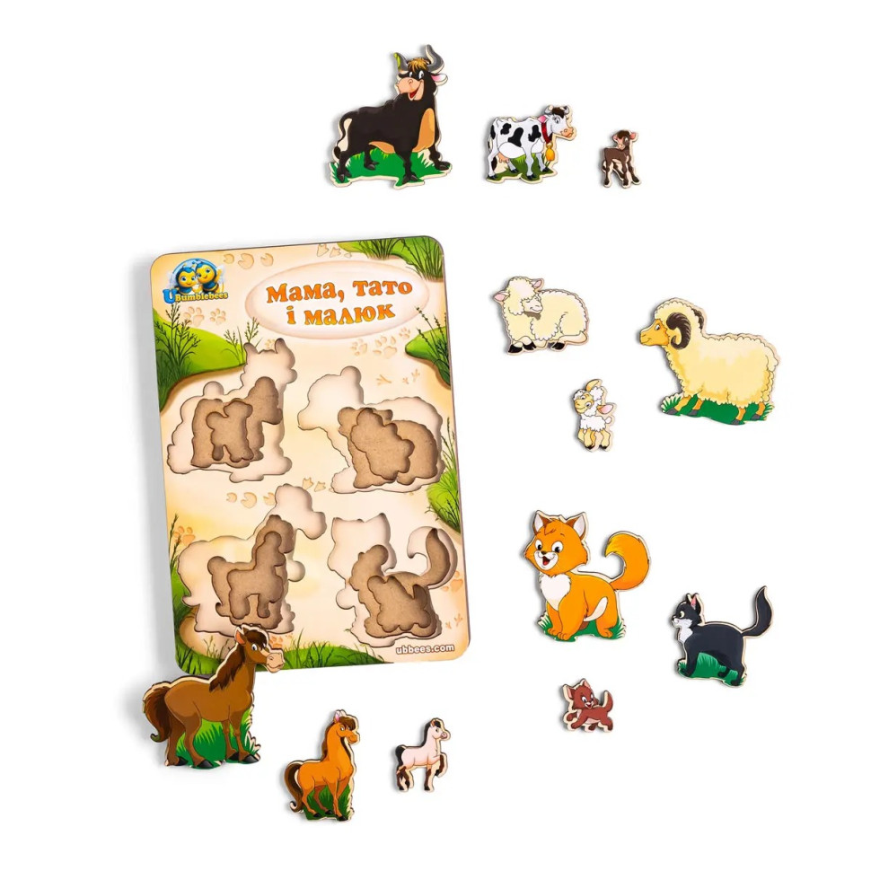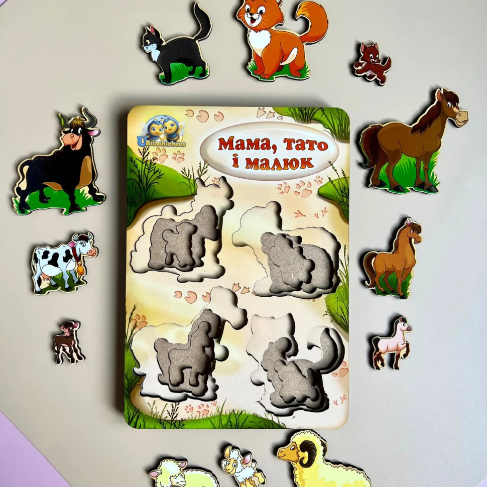 Развивающий трёхслойный набор включает 12 фигурок домашних животных — по три на каждый вид: папа, мама и детёныш. Все элементы различаются по размеру и форме, поэтому малышу предстоит правильно распределить их по соответствующим выемкам.