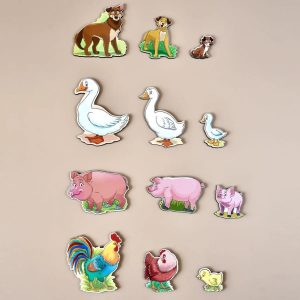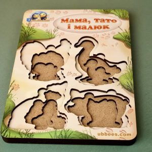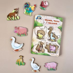Объёмный трёхслойный пазл-вкладыш состоит из 12 фигурок домашних животных — по три на каждый вид: папа, мама и малыш. Все элементы различаются по размеру и форме, поэтому ребёнку нужно правильно разместить их в соответствующие углубления на игровом поле.