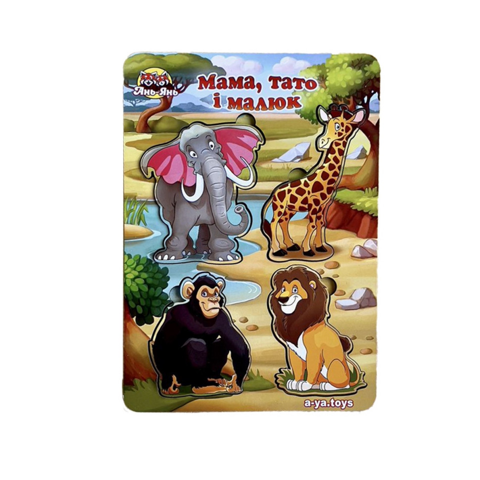 Многоуровневый набор вкладышей включает 12 фигурок диких животных — по три на каждый вид: папа, мама и детёныш.