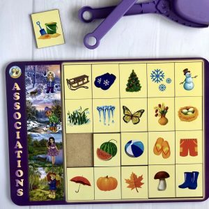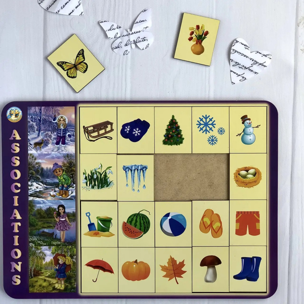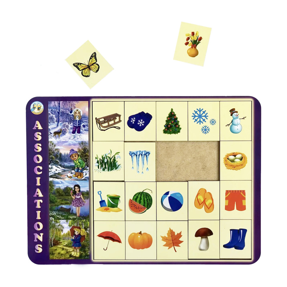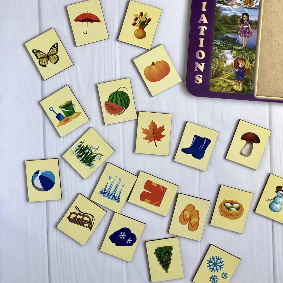 Деревянная рамка-планшет с четырьмя яркими изображениями, отражающими времена года. В комплекте 20 карточек, разделённых на 4 ряда, каждый из которых соответствует определённому сезону. Ребёнку необходимо правильно распределить и собрать карточки по порядку, согласно сезонам.