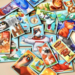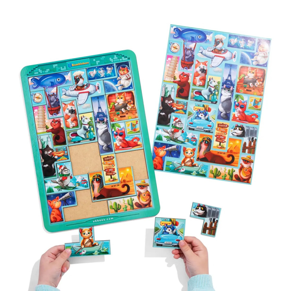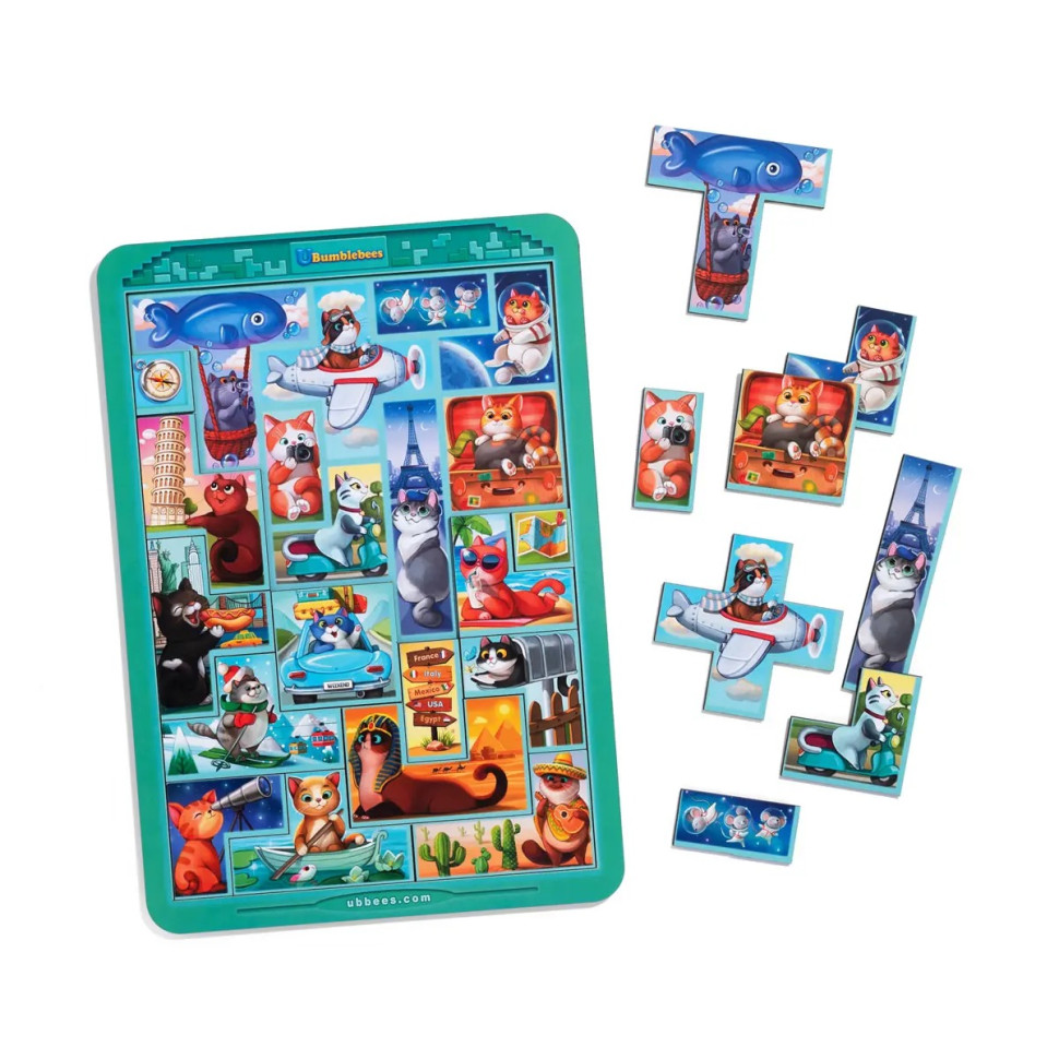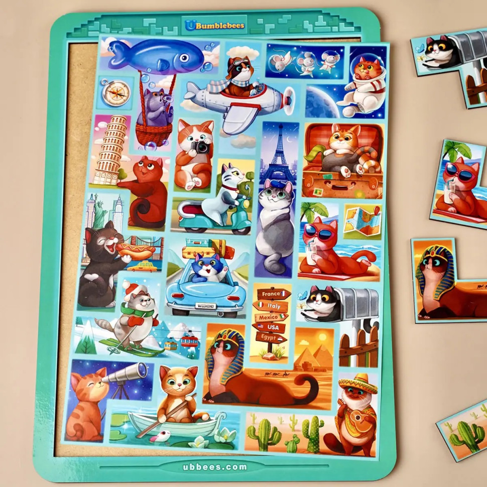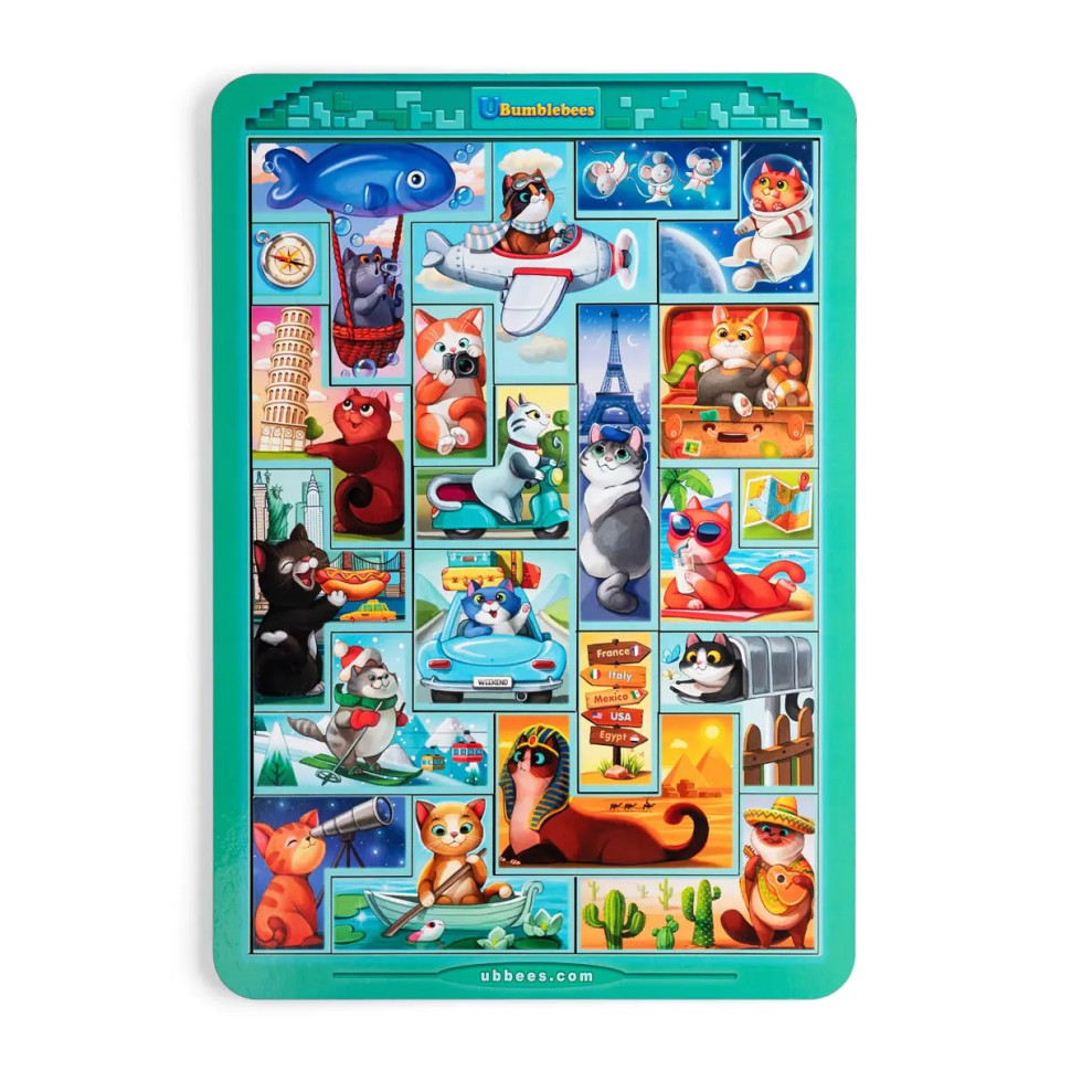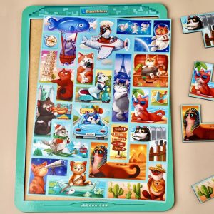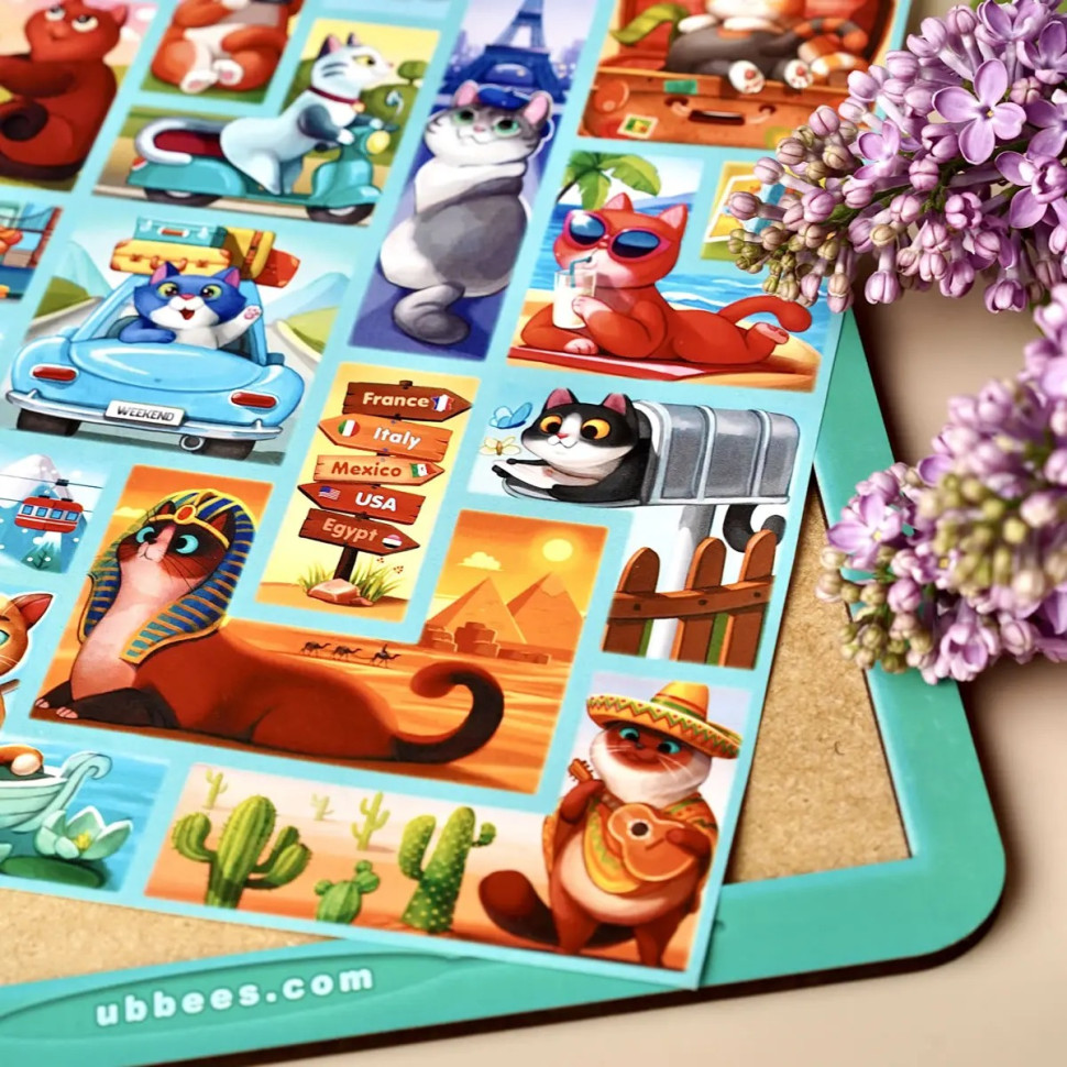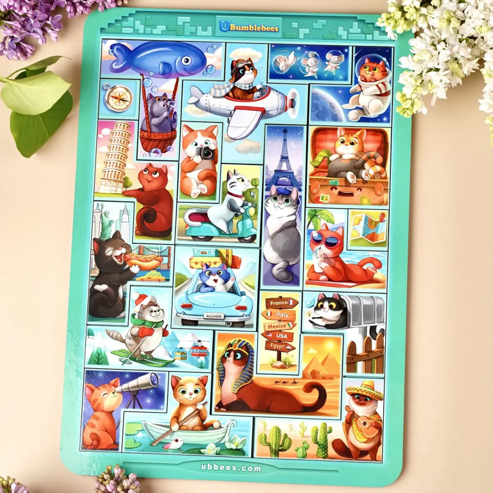 Разложите тематические фигурки на планшете в соответствии с образцом (в наборе есть картинка-подсказка), чтобы узнать, по каким странам путешествуют эти замечательные котики. Изучаем страны мира и считаем пушистиков. Предложите ребенку придумать интересные имена для каждого героя.
