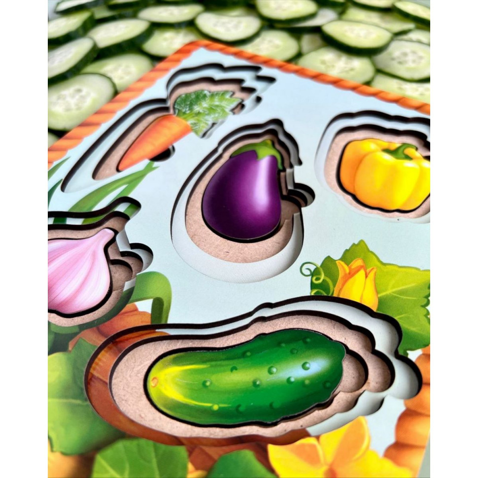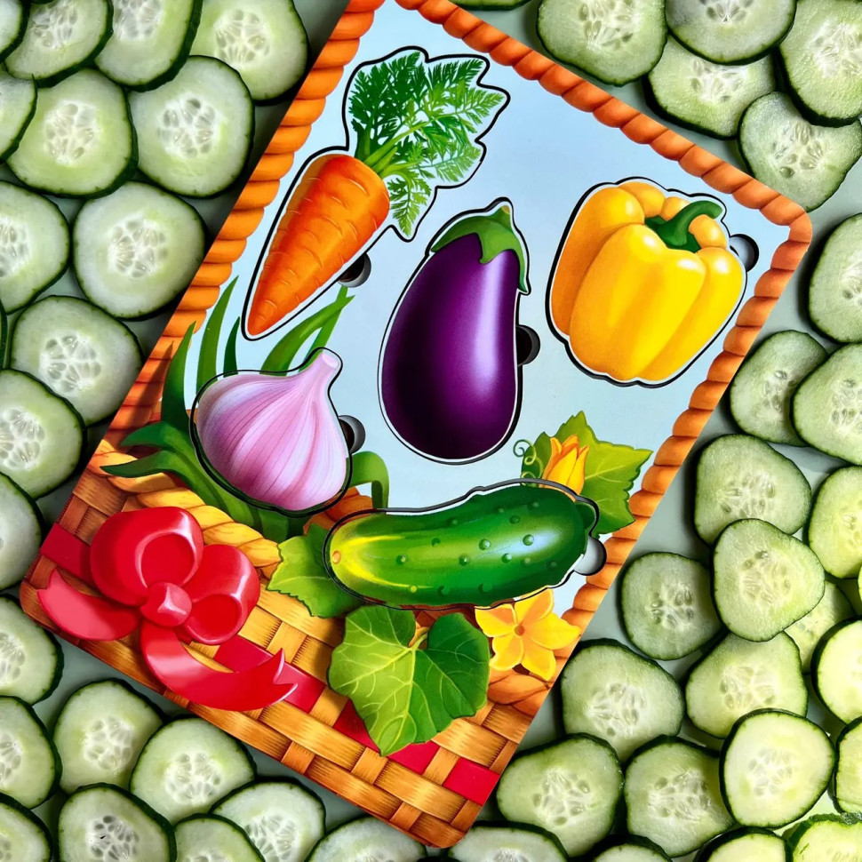 В комплект входят 15 вкладышей 5 видов. Для каждого овоща предусмотрено 3 вкладыша разного размера. Маленькие овощи спрятаны под большими, а для удобства вынимания из основания предусмотрены специальные выемки. Игра поможет ребенку познакомиться с названиями овощей, усвоить понятие «больше-меньше» и научиться сортировать предметы по размеру и форме.