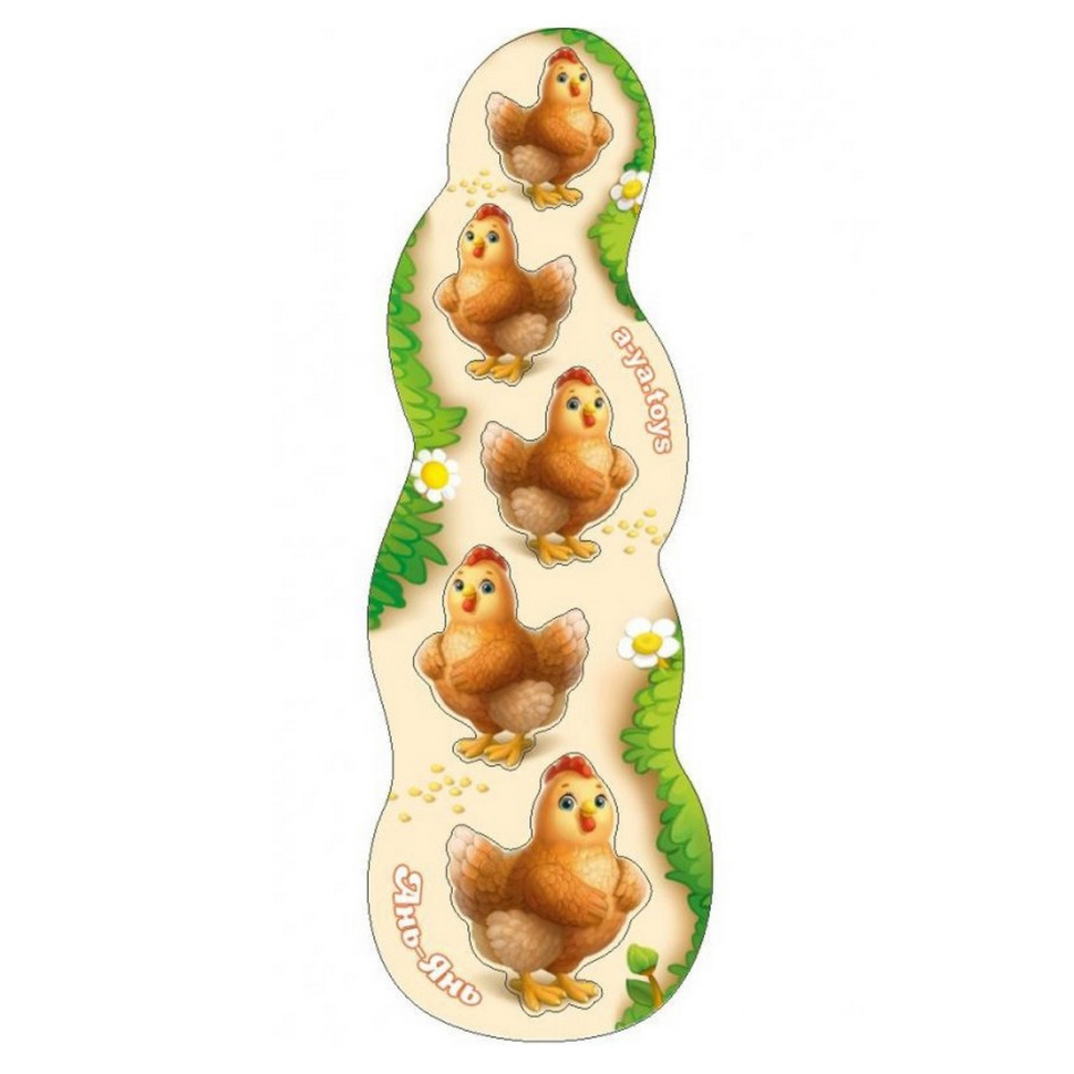 В наборе есть 5 курочек разного размера. Благодаря этой игре легко объяснить ребенку понятие размера и значения слов «большой», «средний» и «маленький».